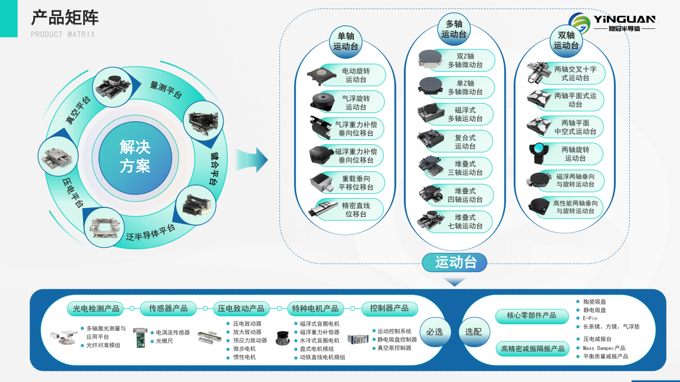 覆盖纳米级(±10nm)至亚微米级定位精度;针对检测/扫描场景优化速度;支持单轴至六自由度多轴平台配置。